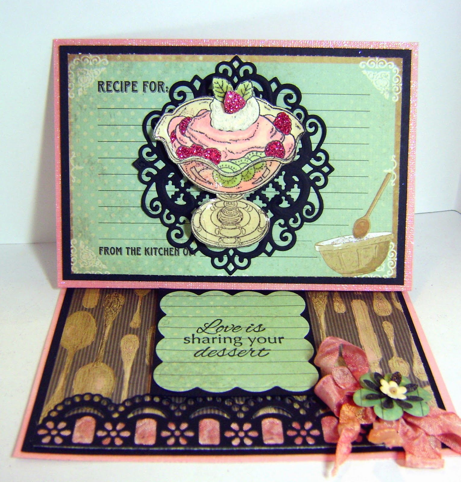 This is how the card looks when it is closed. I used Dazzling Rose glitter G1085 on the berries. For the whipped cream I applied White Liquid Applique and added Sparkling Snow glitter G1003 on it and heat set it. I also used the Sparkling Snow glitter in the mixing bowl in the corner. Diamond Glaze was used on the ice cream bowl.